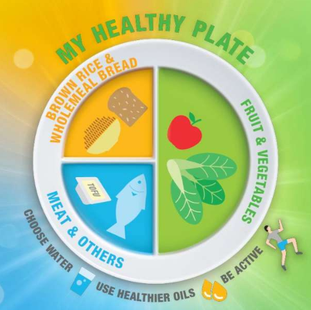 My Healthy Plate is a visual guide to healthier eating – fill quarter of the plate with wholegrains, another quarter plate with good sources of protein (fish, lean meat, eggs, plant-based proteins like soy milk, tofu, tempeh, nuts, beans and legumes) and fill half the plate with vegetables and fruits. Make water your drink of choice and eliminate sugar-sweetened beverages.